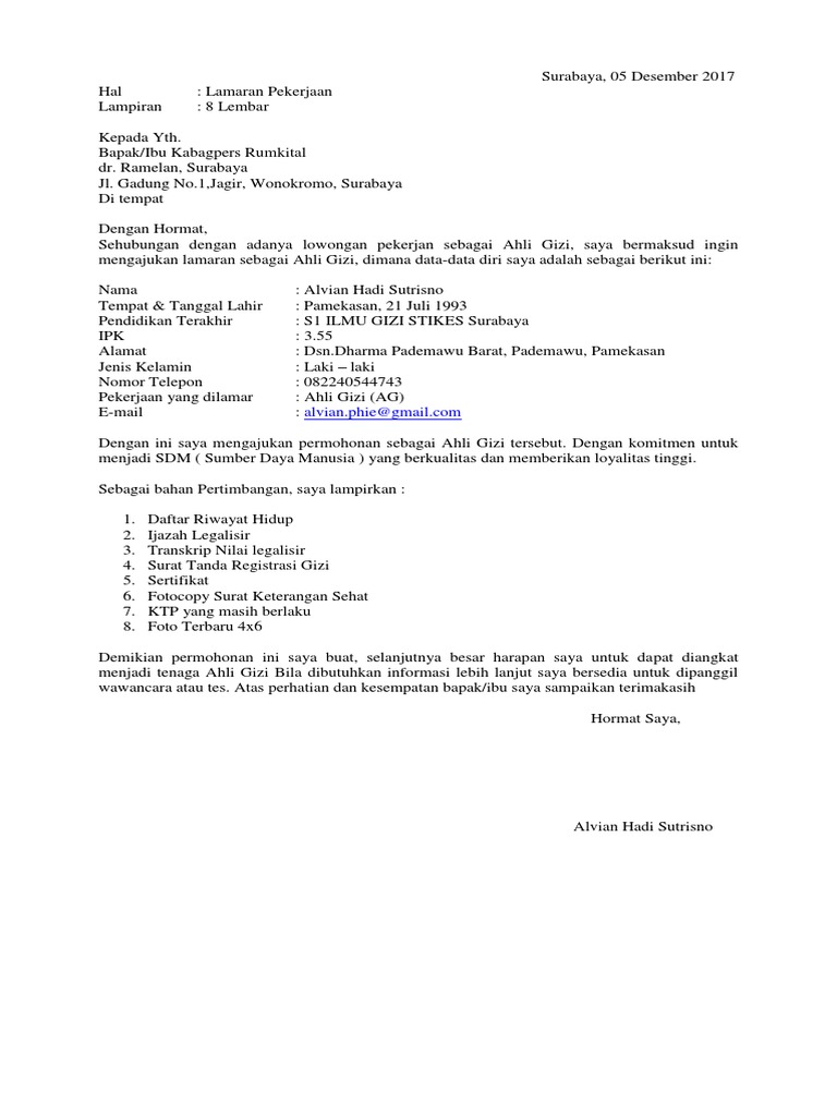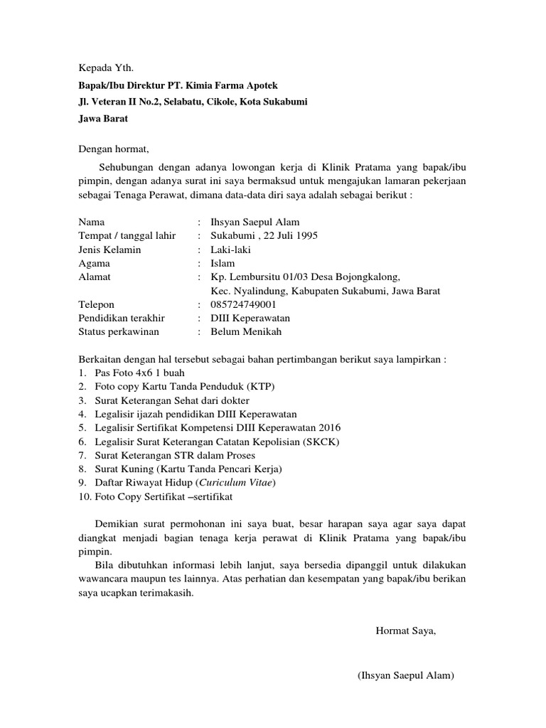 Saya doakan agar mendapatkan posisi yang tepat saya akan memberikan contoh surat lamaran kerja yang baik dan benar + disukai hrd. Jika anda sudah memiliki pengalaman kerja di rumah sakit tertentu sebagai seorang perawat, maka akan sangat baik jika anda melampirkan. Sebelum ke pembahasan utama mengenai contoh surat lamaran kerja, sebaiknya kita ketahui terlebih dahulu format, cara, dan tips dalam berikut adalah beberapa contoh surat lamaran kerja yang ditunjukkan untuk beberapa perusahaan, seperti pt, bank, indomart, dan lain sebagainya. Rekomendasi paling lengkap dan terbaru. Format untuk menulis surat lamaran kerja bagian administrasi rumah sakit hampir sama dengan surat lamaran kerja bagian lainnya. Bagi yang butuh contoh surat lamaran kerja perawat, di artikel ini kami akan sharing kepada anda. 10 contoh surat lamaran pekerjaan lengkap yang baik dan benar. Jika diminta surat lamaran kerja dalam bentuk tulis tangan saat melamar pekerjaan di rumah sakit, contoh ini bisa menjadi rujukan anda. Hanya beda pada lampiran yang menyesuaikan tuntutan dari pihak rumah sakit. Jadi ada banyak posisi pekerjaan 8. Contoh lamaran kerja dan cv contoh: Contoh surat lamaran kerja rumah sakit. Pasfoto 4×6 sebanyak 3 lembar.